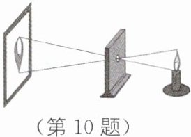 10. 传统文化 墨子研究小孔成像 早在战国时期,我国古代著名教育家、思想家墨子就在研究小孔成像的现象。如图所示,他用蜡烛作为光源,在木板上钻一个小孔,发现光线透过小孔在墙壁上形成一个倒立的像。下列说法正确的是()。