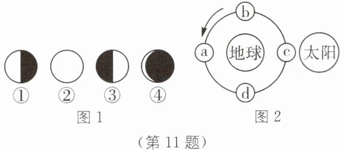 11. 2025年5月31日是端午节。根据图1所示的月相示意图(阴影部分表示暗部)和图2所示的月球运行轨道示意图判断,下列说法正确的是()。
