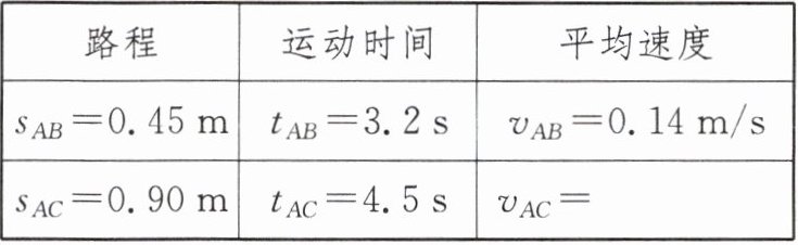 (3)路程$s_{AC}=0.90m$,所用时间$t_{AC}=4.5s$,小车通过AC段路程的平均速度$v_{AC}=\frac {s_{AC}}{t_{AC}}=\frac {0.90m}{4.5s}=0.2m/s$;已知AB段路程与BC段路程相同,$s_{AB}=s_{BC}=0.45m,t_{BC}=t_{AC}-t_{AB}=4.5s-3.2s=1.3s$,BC段平均速度$v_{BC}=\frac {s_{BC}}{t_{BC}}=\frac {0.45m}{1.3s}\approx 0.35m/s$,已知$v_{AB}=0.14m/s$,则$v_{AB}\lt v_{BC}$。
