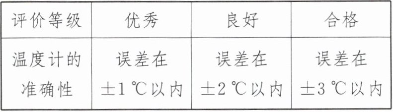 (4)评价:用自制简易温度计测量40℃的温水,显示吸管中液面在距离0℃刻度7.5 cm处。根据以下评价表,请评价此简易温度计属于哪一等级并简要说明原因______。