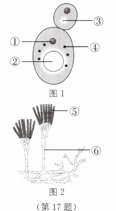 17. 如图是某学生做“观察酵母菌和霉菌”实验时绘制的显微镜下观察到的酵母菌(图1)和青霉菌(图2)形态结构简图,请你根据所做过的实验和观察到的实验现象,回答下列问题(横线上填写文字,括号内填写序号)。
