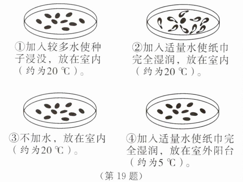 19. 中考新考法 种子萌发实验改进 下面是某同学在寒假期间做的“探究绿豆种子萌发的条件”的实践作业成果。实验步骤如下: