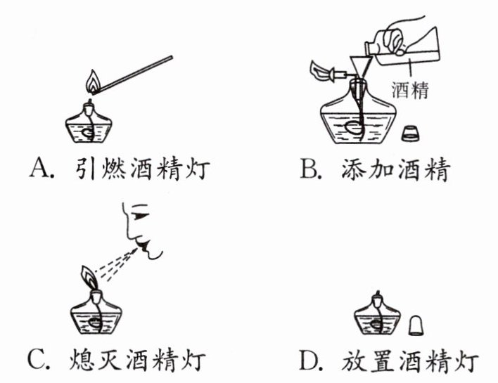 A [解析]应用火柴点燃酒精灯,不能用燃着的酒精灯引燃另一盏酒精灯,故A操作正确;给酒精灯添加酒精时,需要使用漏斗,不能向燃烧的酒精灯添加酒精,故B操作不正确;熄灭酒精灯时应用灯帽盖灭,不能用嘴吹灭酒精灯,防止发生火灾,故C操作不正确;放置酒精灯时,应用灯帽盖住,故D操作不正确。故选A。