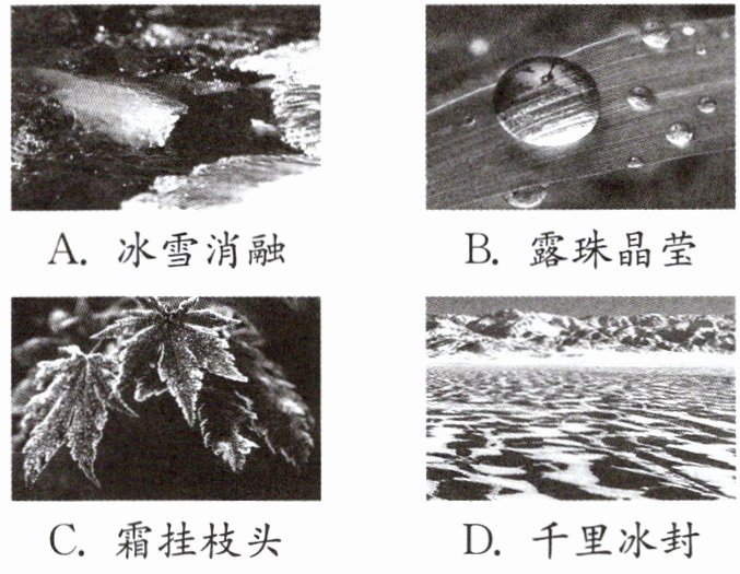 D [解析]雨水,冰雪消融,固态的冰雪变成液态的水,是熔化现象,故A不符合题意;大寒,滴水成冰,液态的水变成固态的冰,是凝固现象,故B不符合题意;立夏,雾绕山峦,气态的水蒸气变成液态的小水珠,是液化现象,故C不符合题意;霜降,霜满枝头,气态的水蒸气变成固态的小冰晶,是凝华现象,故D符合题意。故选D。