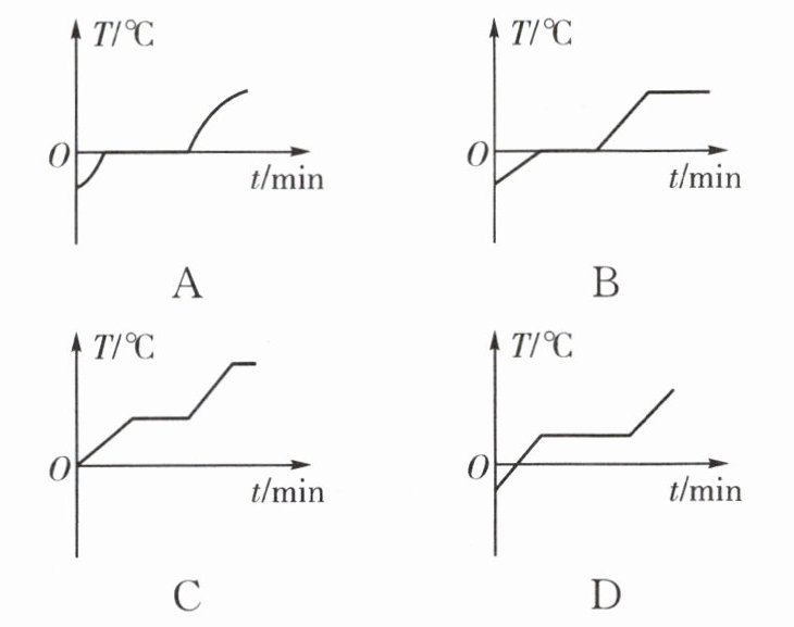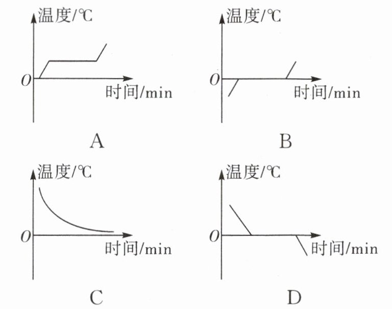 D [解析]舌头会被“冻”在冰棍上,冰棍贴紧舌头,舌头上的水分温度先降低,降到零摄氏度开始凝固,凝固过程中温度不变,凝固结束后变成冰,温度继续降低,最后舌头会被“冻”在冰棍上。对应的温度—时间图像应该是温度降低,降到零摄氏度,接着开始凝固,凝固过程中温度不变,凝固结束温度又降低,故A、B、C不符合题意,D符合题意。故选D。