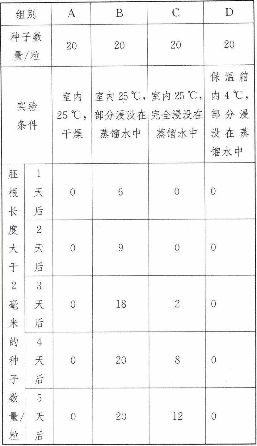 (3)B组和D组除温度外,其他实验条件都相同,故小组同学进行B组和D组实验对比研究的方案设计时,基于的假设是种子的萌发需要适宜的温度。