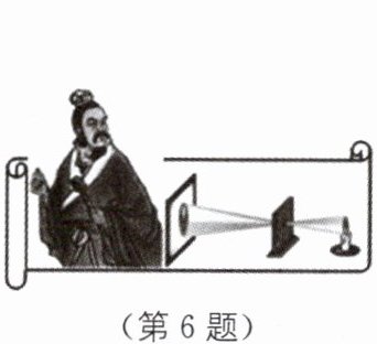 6. 早在战国时期,我国古代著名教育家、思想家墨子就在研究小孔成像的现象。如图所示,他用蜡烛作为光源,在木板上钻一个小孔,发现光线透过小孔在墙壁上形成一个像。下列说法正确的是()。