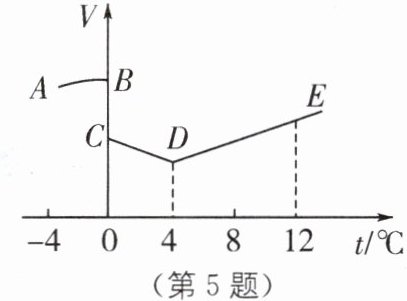 B [解析]读图可知,该物质是晶体,熔点为 $0^{\circ}C$,而且这种晶体在 $0^{\circ}C$ 这一温度点时,体积由 $B$ 到 $C$,明显变小,因此这是冰在熔化成水。$AB$ 段的温度在零下,所以该物质处于固体状态,$BC$ 段处于熔化过程,从 $C$ 到 $E$ 的过程中,该物质是液态。该物质 $DE$ 段存在状态相同,$D$ 点体积最小,由 $\rho=\frac{m}{V}$ 可知,$D$ 点密度最大,因此 $D$ 点密度大于 $E$ 点密度。