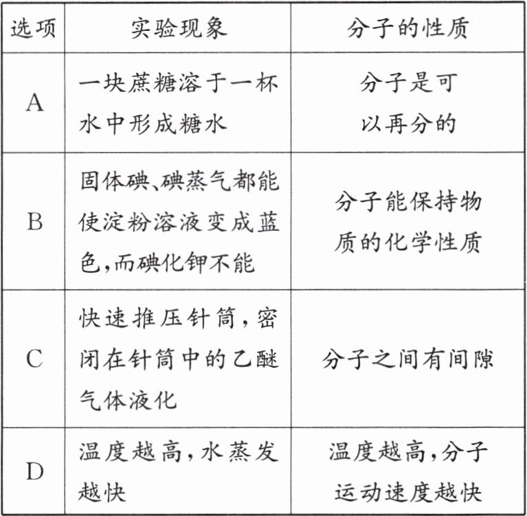 A [解析]一块蔗糖溶于一杯水中形成糖水,说明分子在不停地做无规则运动,与“分子是可以再分的”无关。