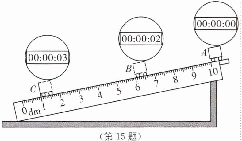 15. 某兴趣小组用如图所示的实验装置“测量小车运动的平均速度”。将小车从带刻度斜面的A点静止释放,并同时按下秒表开始计时,图中圆圈内显示了小车位于A、B、C三点的时刻(数字分别表示“时:分:秒”)。