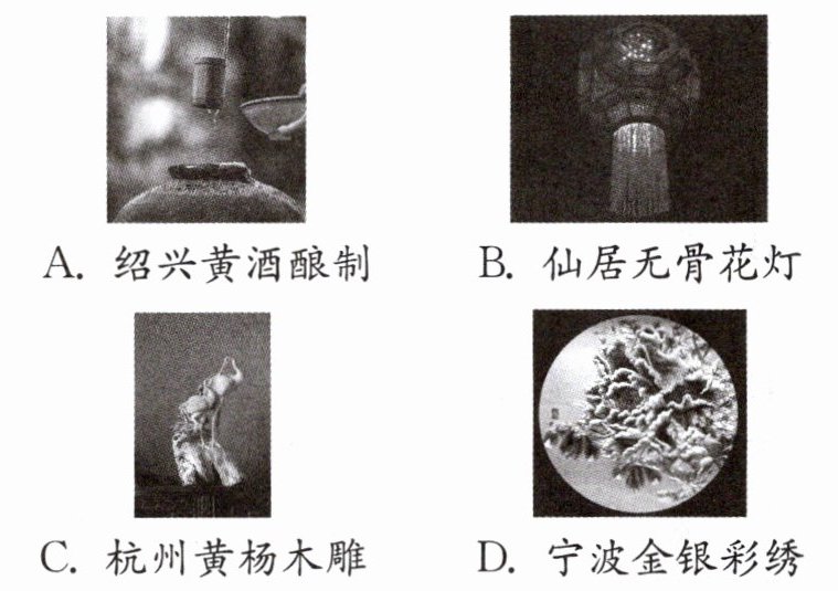 A [解析]绍兴黄酒酿制过程中有新物质酒精等生成,是化学变化,A符合题意;仙居无骨花灯制作过程中只是形状发生变化,没有新物质生成,是物理变化,B不符合题意;杭州黄杨木雕的制作过程中只是形状发生变化,没有新物质生成,是物理变化,C不符合题意;宁波金银彩绣制作过程中只是形状发生变化,没有新物质生成,是物理变化,D不符合题意。