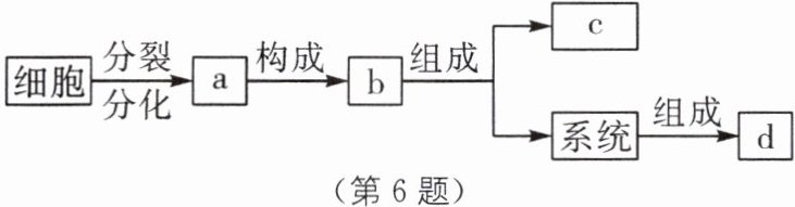 D [解析]c表示的结构层次是植物体,A错误;动物和植物的结构层次不同,动物体比植物体多系统这一结构层次,B错误;a表示组织,b表示器官,叶片表皮是保护组织,动物的血液是结缔组织,C错误;动物体的结构层次为细胞→a组织→b器官→系统→d动物体,D正确。