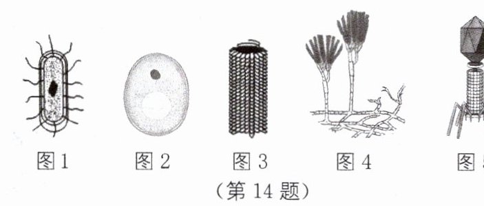 14. 如图是几种微生物的形态结构图,请据图回答有关问题。