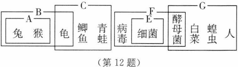 12. 如图是根据生物的相似点和不同点进行分类的图示,例如,A类是可以以动物的体温基本恒定为依据进行分类。据此回答下列问题。