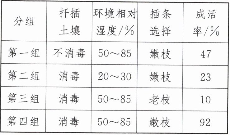 (2)第一组和第四组实验除了扦插土壤是否消毒不同外,其他条件都相同,因此变量为扦插土壤是否消毒,故对照第一组和第四组可以探究扦插土壤消毒对扦插成活率的影响。