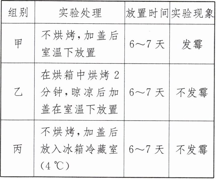 (3)乙组的处理是烘烤后在室温下放置,丙组是未烘烤直接放入冰箱。两组的实验有两个变量,一是烘烤与否,二是温度,变量不唯一,无法得出结论。