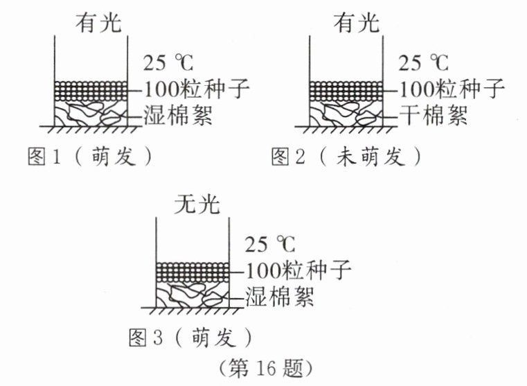 16. 豆芽是我国的一种传统食物,已有两千多年历史。《易牙遗意》记载:“将绿豆冷水浸两宿……预扫地洁净,以水洒湿,铺纸一层,置豆于纸上,以盆盖之。一日两次洒水,候芽长。”某生物兴趣小组根据上述记载判断种子的萌发可能与水、光照等环境条件有关,于是选取300粒饱满的绿豆种子,设计了如图所示的三组实验进行探究。