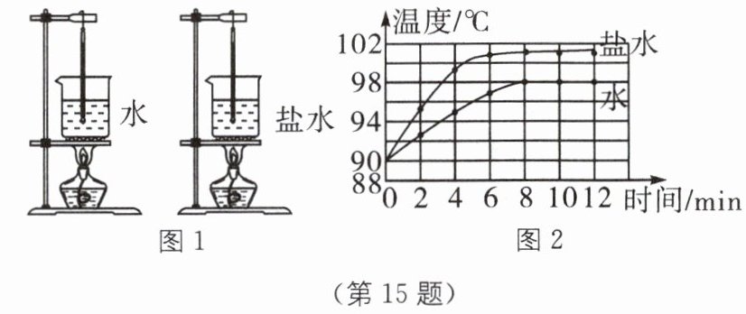 15. 探究液体在沸腾前后温度变化的特点,实验装置如图1所示。取质量相等的水和盐水分别放入两个相同的烧杯中,用相同的酒精灯同时加热,根据实验数据,绘制温度随时间变化的图像,如图2所示。
