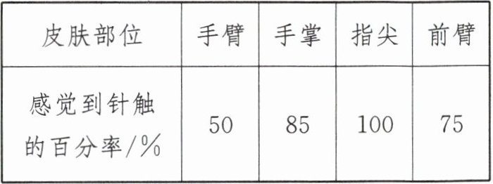 10. 为测试不同部位的皮肤对触觉的敏感程度,小金用一支绘图笔在小明皮肤的某些部位画上测试区。小明蒙上眼睛后,小金用针轻轻接触测试区上不同的点,当小明感觉到针触时,就说“是”,然后小金将小明能感觉到针触的百分率记录下来。在不同部位的皮肤上重复此实验,其结果如表所示,下列说法错误的是()。