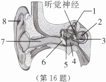 16. 如图所示为人耳的基本结构示意图,据图回答问题。