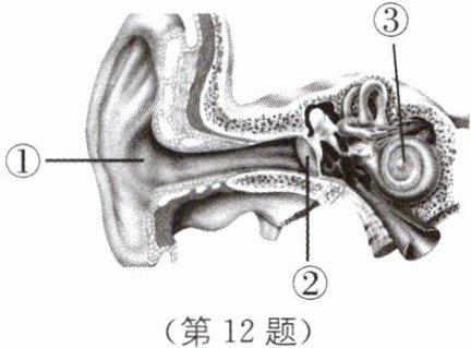12. 声音是以______的方式传播的。如图所示,当外界传来的声音通过①耳廓收集,进入外耳道后便会撞击②______使其产生振动,听小骨把声音放大后再传入③耳蜗。