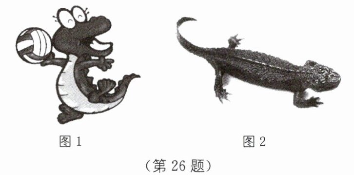 26. 中国女排北仑主场的吉祥物“圆圆”(图1),其原型是宁波市独有的国家二级保护动物——镇海棘螈(图2)。目前它的数量只有350多尾,比大熊猫还稀少,已濒临灭绝。