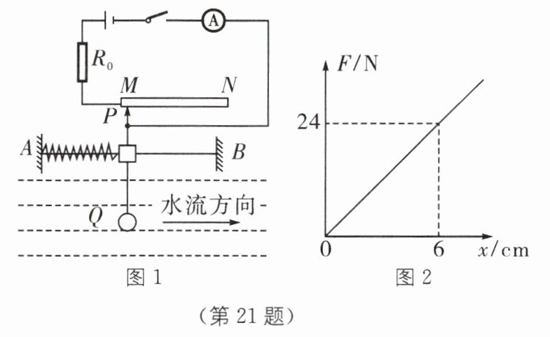 21. 跨学科 数形结合 小华同学为探究水流对不同形状物体的冲击力,设计了一个实验装置,如图1所示。电源电压保持3V不变,电流表量程为0~1A,电阻不计,粗细均匀的电阻丝MN全长为12cm,总电阻为9Ω,它的阻值与其接入电路的长度成正比。水平光滑杆AB上套有弹簧,弹簧弹力与其伸长量x的关系如图2所示,弹簧左端固定,右端连接有滑块,滑块与滑片P、物体Q通过硬杆相连。滑片与电阻丝始终保持良好接触。水流冲击力为零时,滑片P刚好与电阻丝左端相接触,此时电流表满偏。测量时,滑块稳定后,小华通过电流表示数可计算出物体受到的水流冲击力大小。问:
