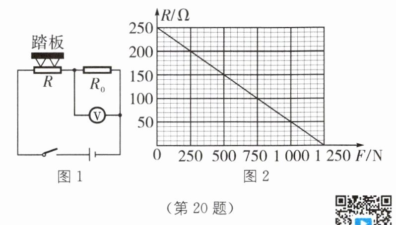 20. 某型号电子秤,其原理结构如图1所示,R₀为定值电阻;R是压敏电阻,其阻值随所受压力F变化的关系如图2所示。改写电压表(量程为3V)的表盘数值后可直接读出所称量物体的质量,设踏板质量为5kg,电源电压保持9V不变,g取10N/kg。