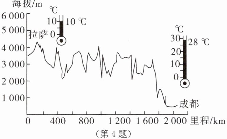 4. 拉萨和成都大致在同一个纬度上,但两地在同一时刻气温差异很大,如图所示,主要原因是()。