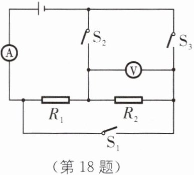 18. 有一电路图如图所示,电源电压恒定。当开关$ S_1 $、$ S_2 $断开,$ S_3 $闭合时,电流表的读数为0.50A,电压表的读数为2.50V。当开关$ S_1 $、$ S_2 $闭合,$ S_3 $断开时,由于电阻$ R_1 $、$ R_2 $中有一个电阻出现故障,电流表的读数为0.60A,电压表的读数为3.00V。则电源电压为______V,电路中出现的故障是______。