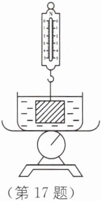 17. 如图所示,将一冰块用细线拴住慢慢地浸入到酒精中,在冰块浸没前发现弹簧测力计的示数在逐渐减小,是因为冰块受到酒精对它的______;当冰块完全浸没并保持悬置状态时,此时冰块受到的浮力______(填“大于”“等于”或“小于”)重力;当冰块完全熔化后,台秤的读数将______(填“变小”“不变”或“变大”)。(已知:冰的密度为$ 0.9×10^3kg/m^3 $,酒精的密度为$ 0.8×10^3kg/m^3 $;整个过程中无液体溢出)
