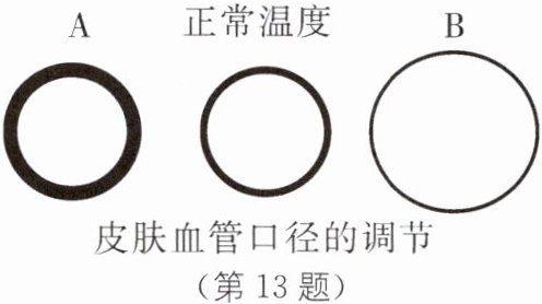 13. 如图所示为人体皮肤血管在不同环境温度下的舒缩情况。入冬以来冷空气频频来袭,在低温环境中,人体的皮肤血管状态如______(填“A”或“B”)所示。同时,人体骨骼肌会发生“战栗”以增加______(填“产热”或“散热”)量。