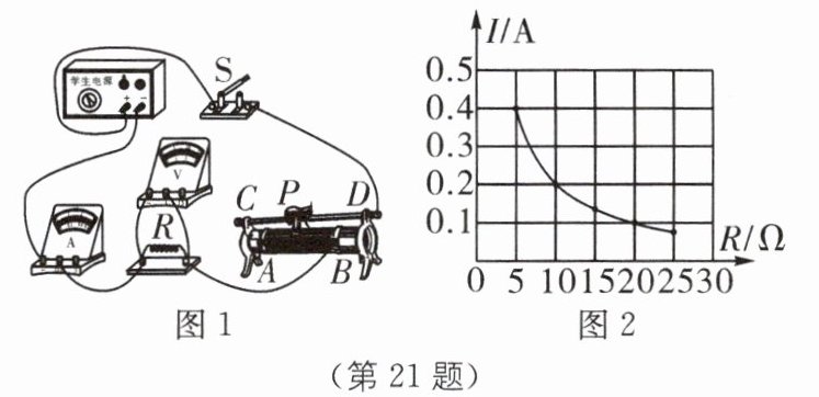 21. 小张和同学们在做“探究导体中电流跟电阻的关系”的实验中,各组所用的实验器材完全相同,如图1所示。器材有学生电源(3V不变)、电流表、电压表、定值电阻(5Ω、10Ω、20Ω、25Ω各一只),滑动变阻器$ R_1 $(10Ω 1A)、滑动变阻器$ R_2 $(20Ω 1A)、开关、导线若干。小张将实验数据记录在表中,并在图2坐标系中作出I-R图像。