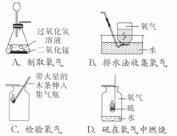 A [解析]本题考查了实验室制取氧气的相关知识,对具体实验操作是否正确进行判断。过氧化氢溶液加入二氧化锰,能加快产生氧气的速度,为了防止产生的氧气从长颈漏斗逸出,需要将长颈漏斗下端插入液面下方,A错误;氧气不易溶于水,收集氧气可以采取排水法,B正确;检验气体是否是氧气,可将带火星的木条伸入集气瓶,观察是否复燃,C正确;硫在氧气中燃烧,发出明亮的蓝紫色火焰,产生有刺激性气味的二氧化硫,为防止污染空气,可用水吸收二氧化硫,D正确。故选A。