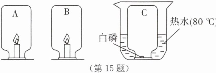 15. 三个集气瓶中只盛有氧气、空气和二氧化碳中的某一种气体,分别将集气瓶按照下图所示方式倒扣住蜡烛和白磷。
