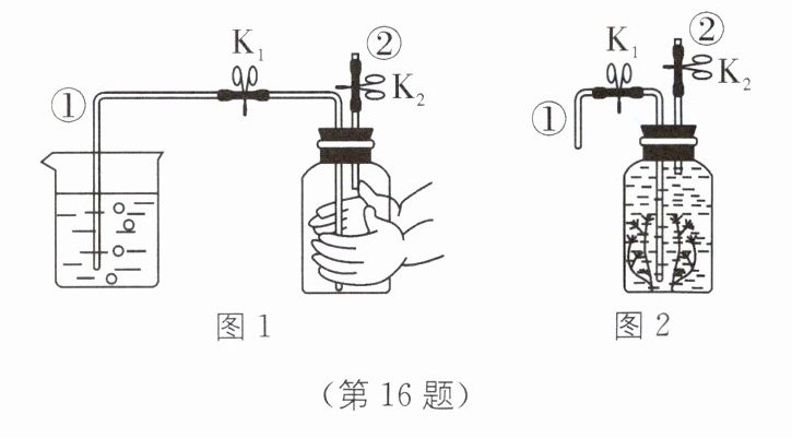 16. 某同学在网上查到了以下资料:溴百里酚蓝是一种灵敏的酸碱指示剂,在酸性环境中呈黄色,中性环境中呈绿色,碱性环境中呈蓝色。他用如图所示的装置探究光合作用的原料和产物,实验步骤如下。