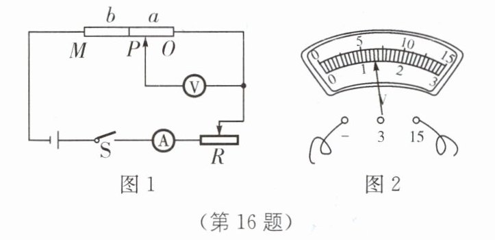 16. 在“探究影响导体电阻大小的因素”的实验中,取两根材料不同、横截面积相同的金属丝a、b,连接成如图1所示的实验电路,O、M分别为金属丝a、b的端点,P是金属丝上可移动的接触点。在实验过程中,电流表示数始终为1.25A。电压表示数U随O、P间距离x的变化如下表所示。