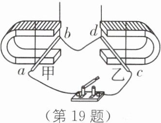19. 小满同学做了一个如图所示的装置。闭合开关,用外力使导体ab水平向右运动,发现导体棒cd也随之运动起来,则实验装置中甲部分应用的物理原理是______,乙部分产生的现象与______的工作原理相似。