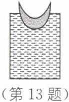 13. 为了测量硬塑料制成的锅形物体的质量和体积,先用一圆柱形容器盛满水,该容器的底面积为$100cm^2($壁厚度不计)。将锅形物体开口向上放入容器中,物体漂浮(如图所示),容器内溢出了$300cm^3$的水。然后慢慢翻转使物体浸没沉底,液面下降了1cm。则锅形物体的质量为______kg,体积为$______cm^3。$(g取10N/kg)