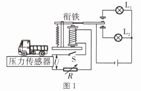 (1)车辆不超载时,工作电路中绿灯亮;当传感器所受压力增大到一定程度时,红灯亮,说明汽车超载。则红灯为______(填$“L_1”$或$“L_2”)。$