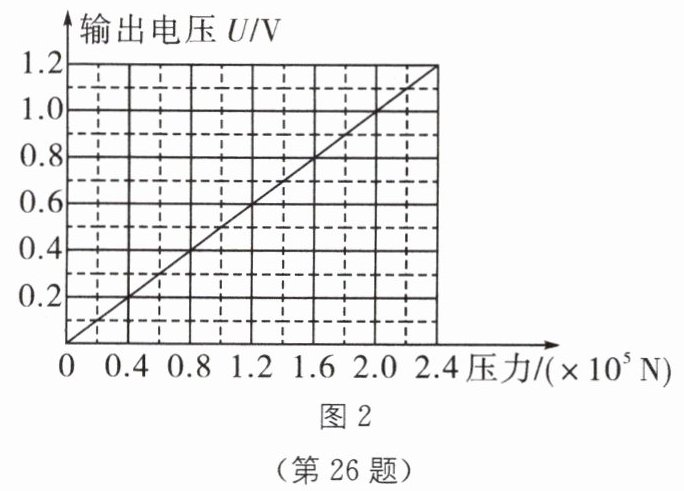 26. 小强利用压力传感器、电磁继电器、阻值可调的电阻R等元件,设计了一个汽车超载自动报警电路,如图1所示。他了解到这种压力传感器所受压力越大,输出的电压U就越大,二者的关系如图2所示。闭合开关S,当继电器线圈中电流大于或等于20mA时,衔铁被吸合。已知传感器的输出电压U即为继电器控制电路的电源电压,线圈的电阻为20Ω。