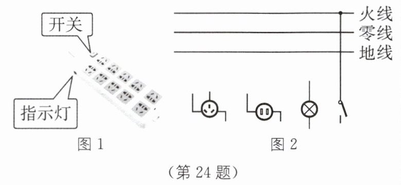 24. 如图1所示,插线板上的指示灯在开关闭合时会发光,插孔正常通电;如果指示灯损坏,开关闭合时插孔也能正常通电。请在图2中画出插线板中开关、指示灯和各插孔的连接方式,并与电源线接通。