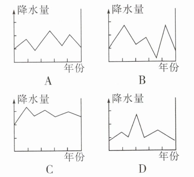 8. 下列四幅降水量年际分布图中,最易发生旱涝灾害的是()。