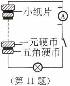 11. 伏打电堆是世界上首个发电器,1800年由意大利人伏打发明。小常同学尝试自制伏打电堆,他将五角硬币和一元硬币各10枚依次堆叠,用浸有食盐溶液的小纸片置于各硬币之间,如图所示。两枚硬币与中间的小纸片相当于一节干电池。