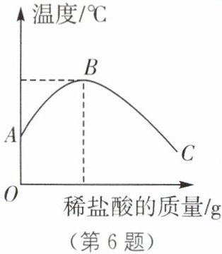 6. 将稀盐酸慢慢滴入装有氢氧化钠溶液的烧杯中,用温度计测出烧杯中溶液的温度,溶液温度随加入稀盐酸的质量的变化如图所示。