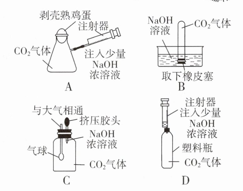 4. 有下列四种实验设计及操作,实验过程中其现象不足以说明$CO_2$与NaOH溶液发生了反应的是()。