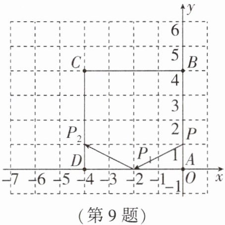 9. 如图,弹性小球从点$P(0,1)$出发,沿如图所示方向运动,每当小球碰到正方形$DABC$的边时反弹,反弹时反射角等于入射角,当小球第$1次碰到正方形的边时的点为P_{1}(-2,0)$,第$2次碰到正方形的边时的点为P_{2}$,…$$,第$n次碰到正方形的边时的点为P_{n}$,则点$P_{2026}$的坐标是____.