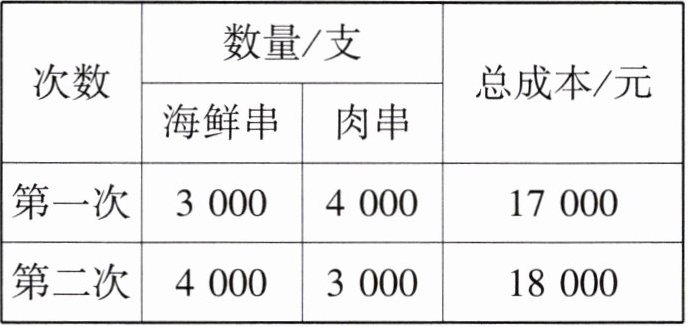 10. (2023·襄阳中考) 在襄阳市创建“经济品牌特色品牌”政策的影响下. 每到傍晚, 市内某网红烧烤店就食客如云, 这家烧烤店的海鲜串和肉串非常畅销, 店主从食品加工厂批发以上两种产品进行加工销售, 其中海鲜串的成本为 $ m $ 元/支, 肉串的成本为 $ n $ 元/支; 两次购进并加工海鲜串和肉串的数量与成本如下表所示 (成本包括进价和其他费用):