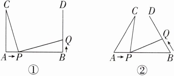 5. (2025·无锡期中)如图①,$AB= 4cm,AC⊥AB,BD⊥AB,AC= BD= 3cm$.点P在线段AB上以1 cm/s的速度由点A向点B运动,同时,点Q在线段BD上由点B向点D运动.它们运动的时间为$t(s).$