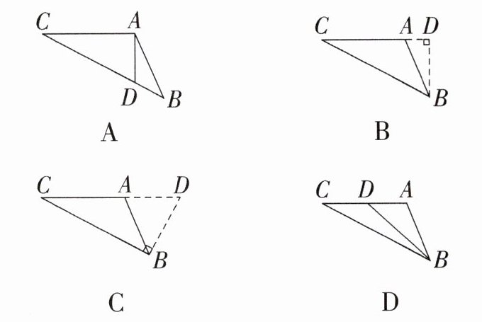 1. (2024·淮安校级月考)下面各选项的$\triangle ABC$中,正确画出$AC$边上的高的图形是 ()